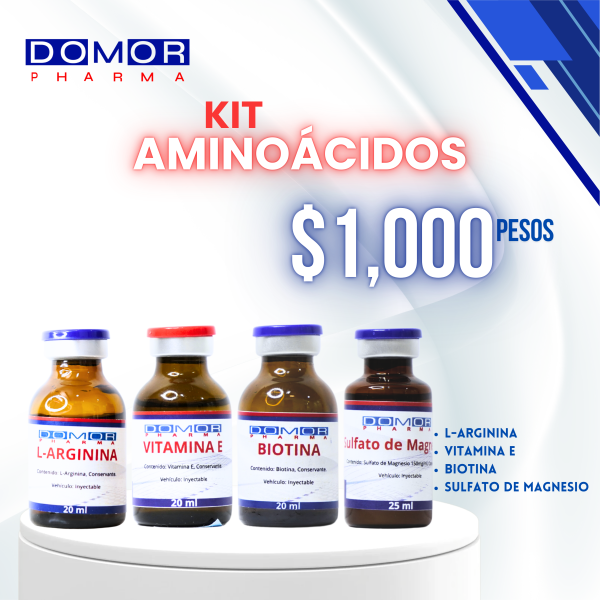 1 valoración en Kit Aminoácidos 4 Viales 1pza L Arginina, 1pza Vitamina E, 1pza Biotina, 1pza Sulfato de Magnesio Valorado en 5 de 5 Luisa Alcalá – agosto 15, 2025 Es un excelente kit que nos ha dado excelentes resultados y nuestros pacientes lo solicitan muchísimo. Gracias admin – enero 14, 2026 Nos alegra leerte, gracias por confiar en DOMOR PHARMA Añadir una valoraciónCancelar respuestaTu dirección de correo electrónico no será publicada. Los campos obligatorios están marcados con *Tu puntuación Puntuar… Perfecto Bueno Normal No está tan mal Muy pobre Nombre *Correo electrónico *Tu valoración * Guardar mi nombre, correo electrónico y sitio web en este navegador para la próxima vez que haga un comentario. Enviar Δ